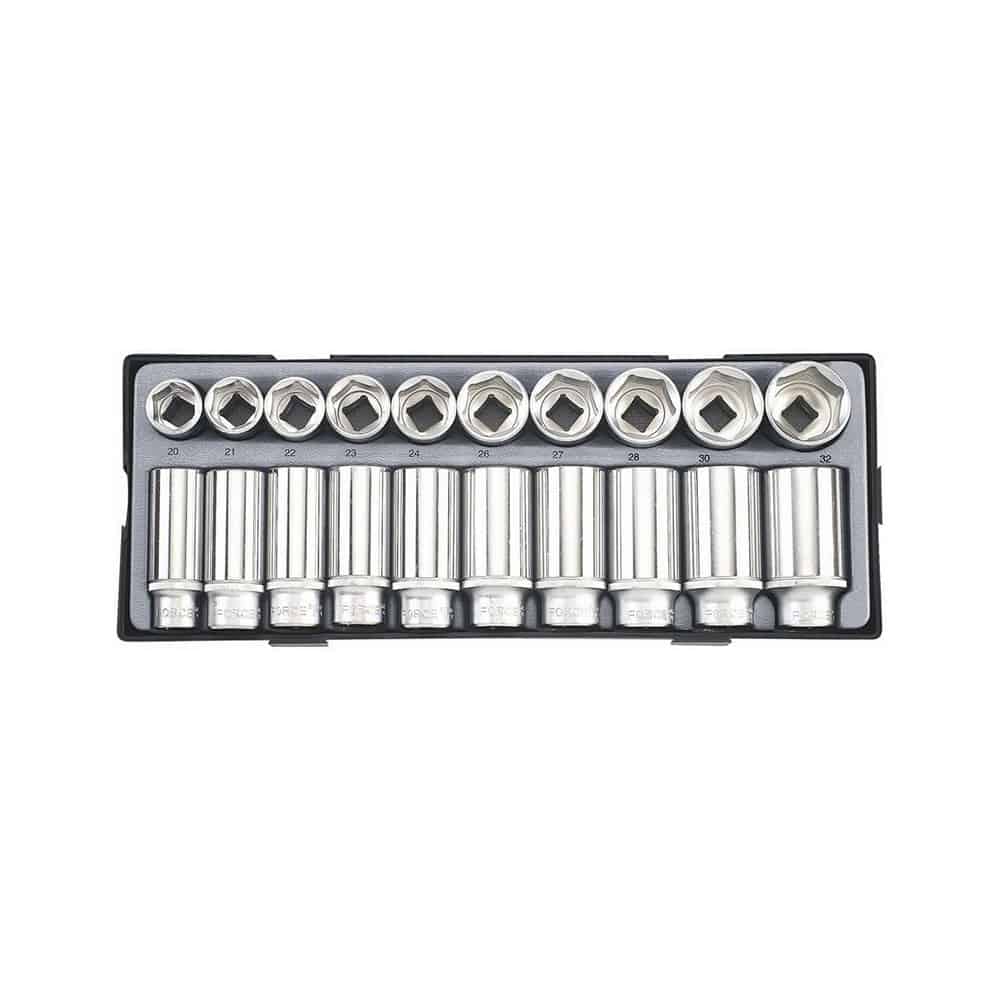 W skład zestawu wchodzi dwadzieścia nasadek 6-kątnych 1/2″: