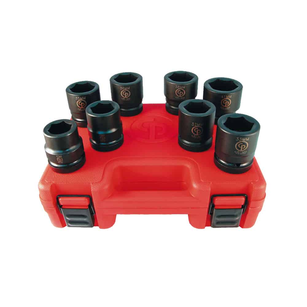 W skład zestawu wchodzi osiem nasadek 6-kątnych udarowych krótkich 1″: